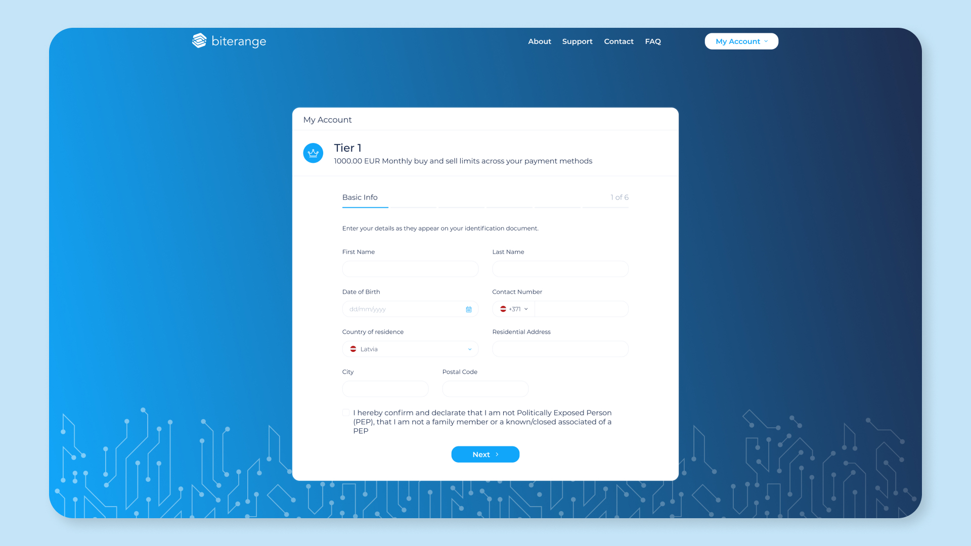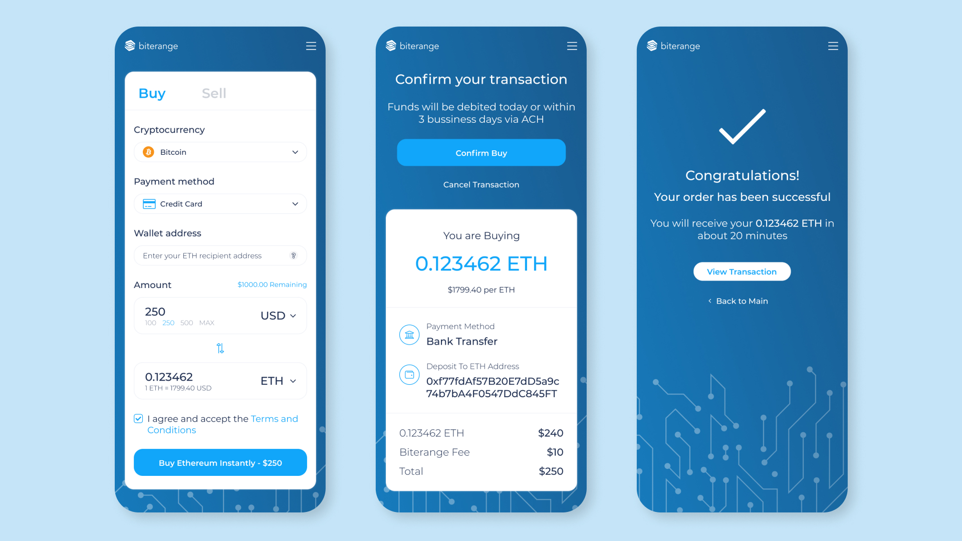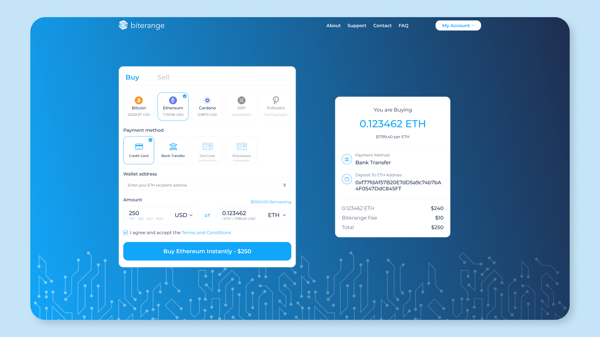 Biterange is a lightweight crypto exchange for buying popular cryptocurrencies